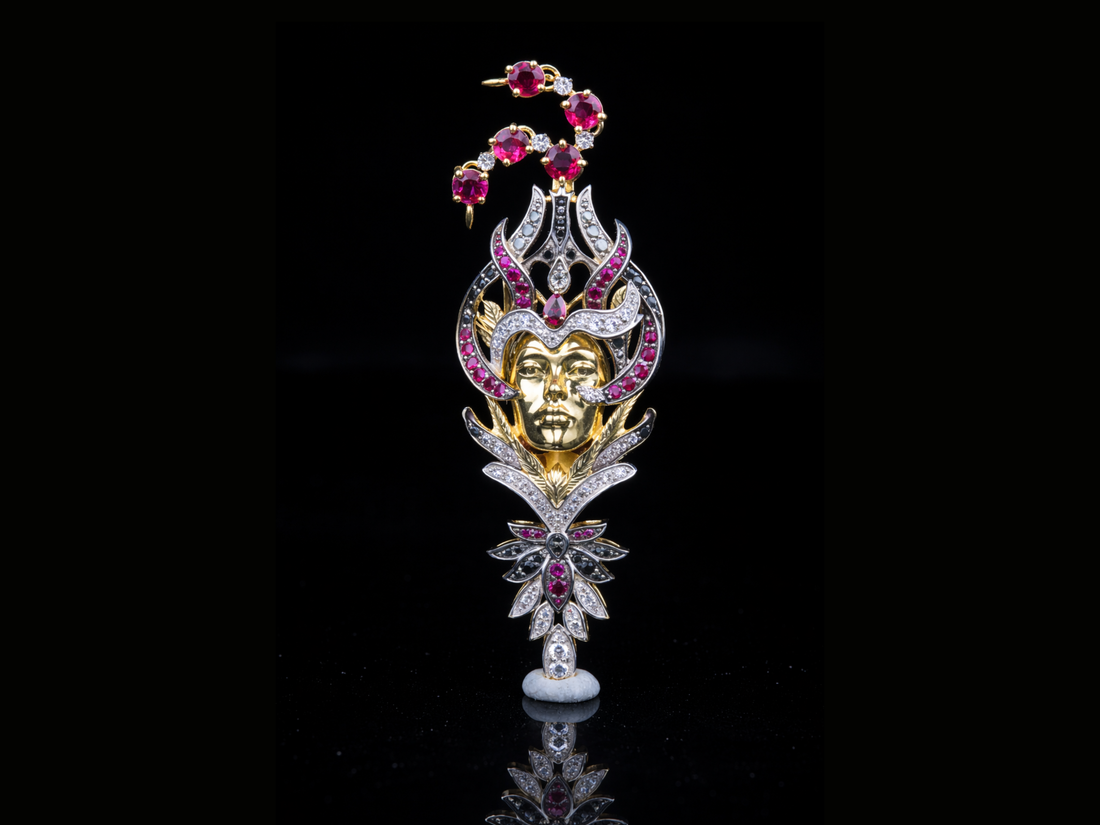Experience divine artistry and luxury craftsmanship with our Luxury Ruby & Diamond Deity Face Pendant....