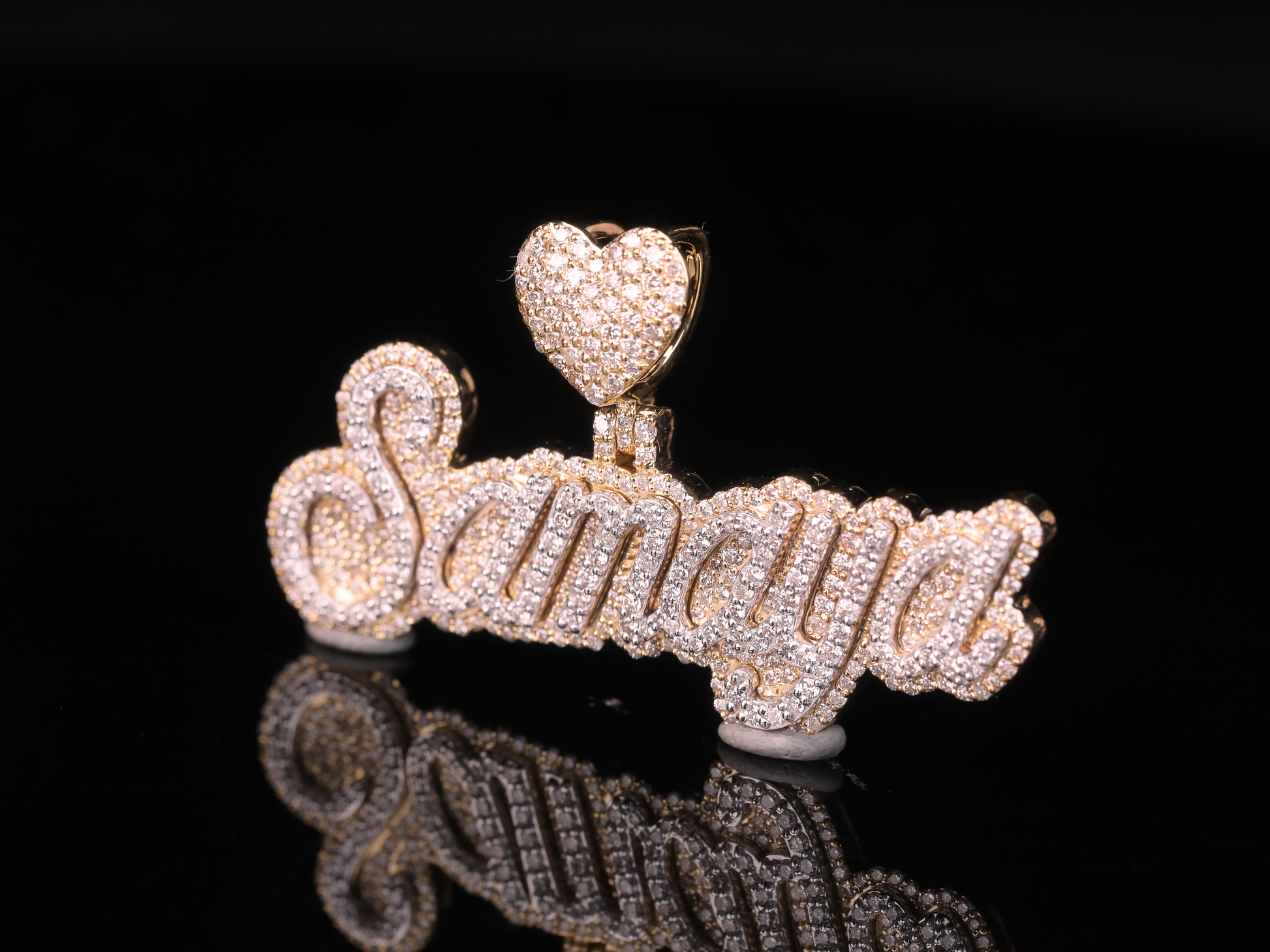 Express love, identity, and luxury with this custom diamond name pendant, beautifully designed with a heart-shaped diamond bail and elegant script lettering. Each letter is hand-set with brilliant diamonds, delivering maximum sparkle and premium craftsmanship.