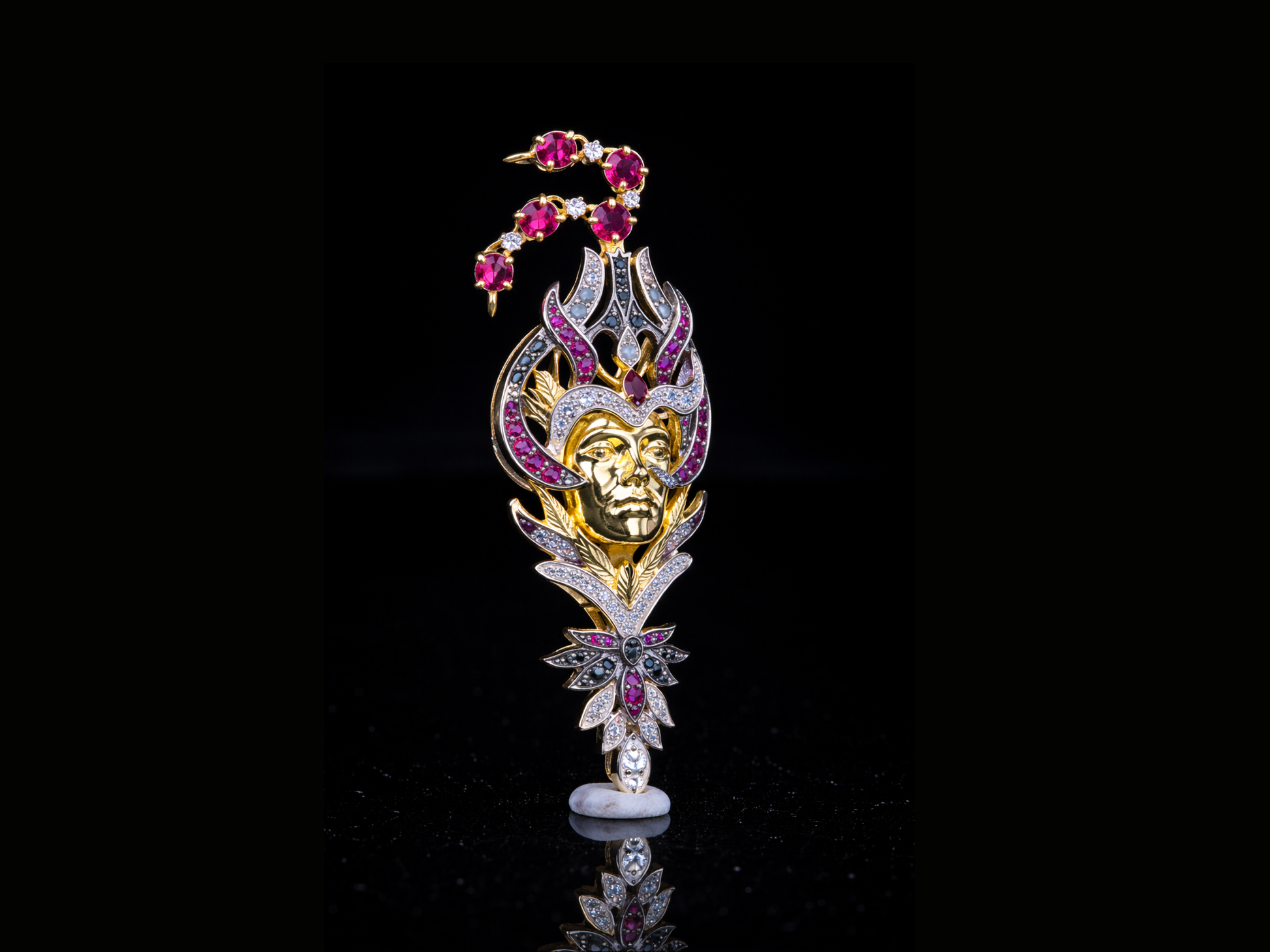 Experience divine artistry and luxury craftsmanship with our Luxury Ruby & Diamond Deity Face Pendant. Featuring an intricately sculpted gold face framed by brilliant diamonds and rich ruby gemstones, this statement pendant blends spiritual symbolism with contemporary fine jewelry design.